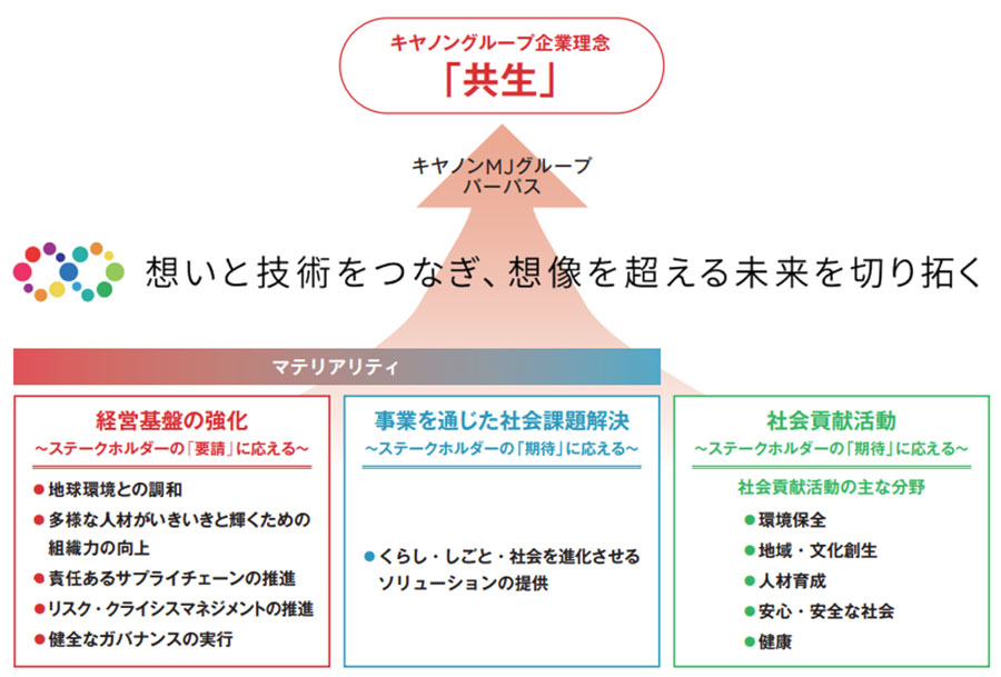 キヤノンマーケティングジャパングループ(以下、キヤノンMJグループ)では、「持続的成長を続ける上で、今、注力すべき重要課題」としてマテリアリティを定義し、ステークホルダーの「期待」および「要請」に応える取り組みを推進しています。また、事業ではリーチしづらい領域における社会課題の解決への貢献をも対象とした「社会貢献活動」を展開しています。マテリアリティを実行し、社会貢献活動を推進することで、企業理念およびパーパスの実践に取り組んでいます。