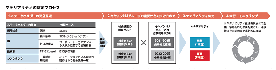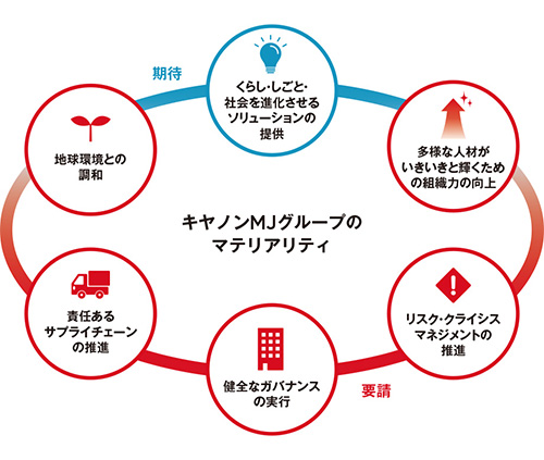 キヤノンマーケティングジャパングループ(以下、キヤノンMJグループ)では、事業に関わるリスクと機会を分析し、サステナビリティ推進委員会での議論を通じて、6つのマテリアリティを策定し、進捗管理を行っています。6つのマテリアリティは、キヤノンMJグループに対する「期待」の1項目と「要請」の5項目に大別され、全てのマテリアリティにKPIを設定し、取り組みを確実化しています。