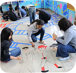 本校の児童はとてもルールをよく守る子どもたちですので、校舎には落書き一つありません。そこに好きなだけ大きな絵を絵具で描ける経験は貴重で、眼を輝かせて描いていました。
