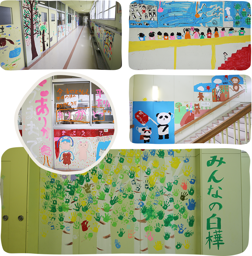 最初に話をしたときに、「えー、いいの」という反応があり、その後で「ここにも描きたい」「あそこにも描きたい」と描きたい場所が広がっていきました。時間や安全面等の制約もあり、全ての場所に描くことはできなかったのですが、描いているときは生き生きと楽しそうでした。中には、「ありがとう、猿賀小学校」と言いながら描いている子どもも複数おり、みんなで旧校舎に感謝の気持ちをもつことができたと思っています。
