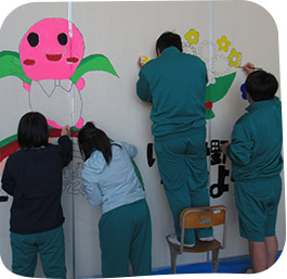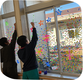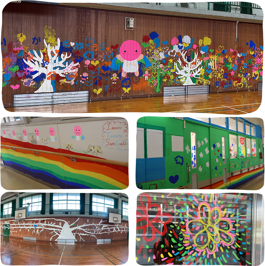 大きな予算がとれない中、絵の具や刷毛、クレヨンやマジックを提供していただけたことで、校舎や体育館の壁や窓をキャンパスに、小・中・高等部の全校児童生徒が参加できる大規模な内容で実現できました。(総務部 大屋)