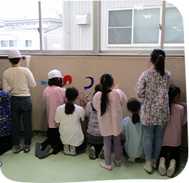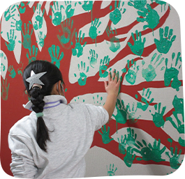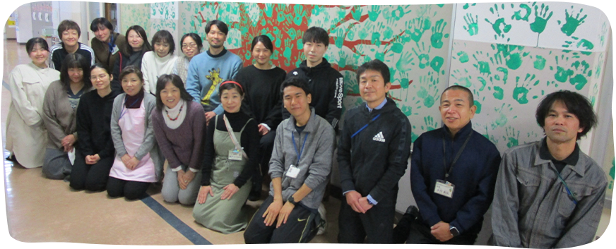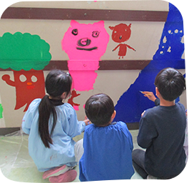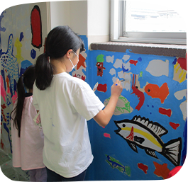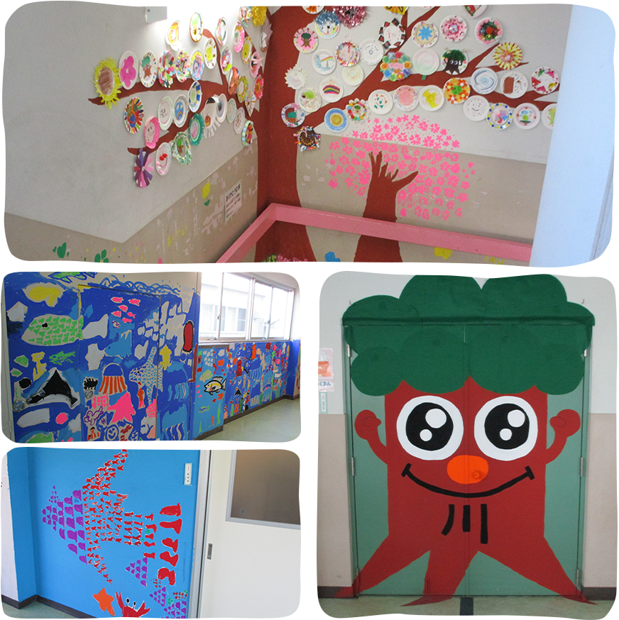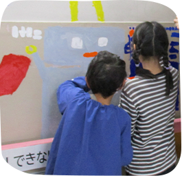 日常、体験できない学校の壁に描くということで、一筆目は戸惑いながらも2学期に練習し、当日は楽しそうに描く姿がとてもよかったです。