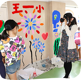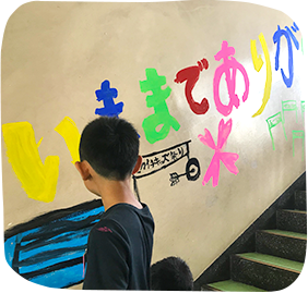 「校舎に描いて本当にいいいの?!」という表情で楽しく活動していた子どもたちの様子が微笑ましかったです(久慈副校長先生)