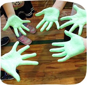 最初は遠慮気味で恐る恐る廊下や体育館壁面に描いていたよいですが、だんだん思い切りがよくなってきて、大胆に大きな場所にたくさんの絵を描いていました。
