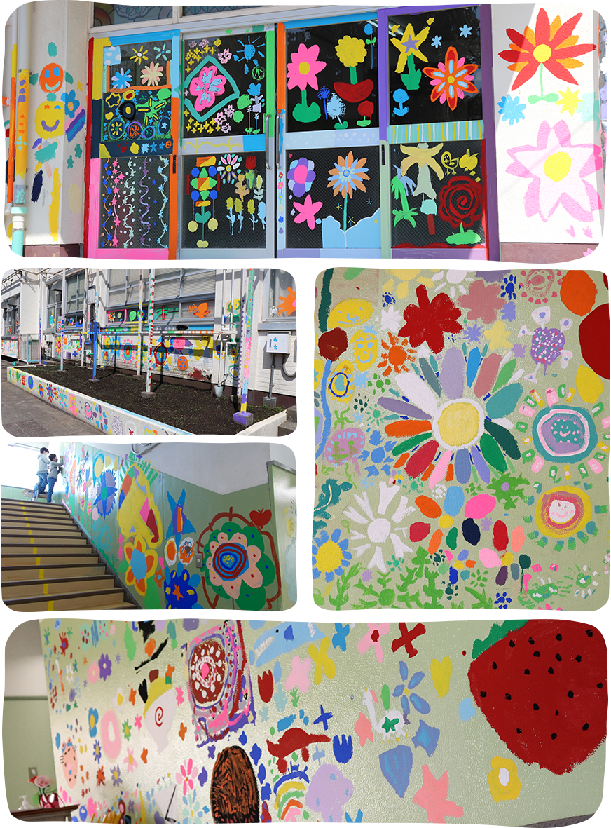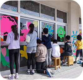 本来なら、地域、保護者の方、卒業生なども一緒にペイントを実施したかったのですが、今回はコロナ禍のため諦めました。しかし、4月になってから子どもたちが描いて咲かせた「ありがとうの花」とこの校庭や校舎の様子を地域の方にも見て頂く見学会を実施し、大変喜んでいただけました。(松井校長先生)