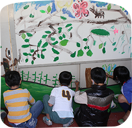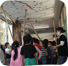 子供たちが自由な発想で描くとなると、???となることを予想し、校舎の2階は「森」、3階は「空と宇宙」という設定にしました。