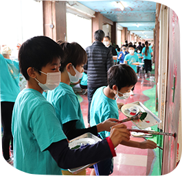 後日、出来上がったペイントの観賞会を行いました。在校生と保護者に加え、卒業生や地域の方々もたくさん見にきてくださいました。校舎を懐かしむ方やなかなかできない経験ができ、ワクワクされていた方など、楽しんでいただけて良かったです。(PTA井上)
