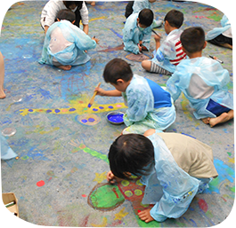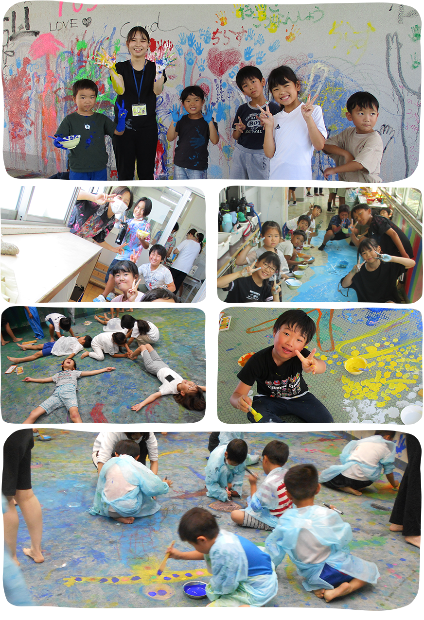 2年生は、「スプラトゥーンをしよう!」というテーマで、最初の活動を行ったので、子どもたちは全身を使って、発色のよい絵の具の色を楽しみ、描いていました。最初は恐る恐る塗っていた子どもたちも、だんだんと自分の世界に入り込み、色を自由に選び、自分の思いを放出させていました。それを繰り返し行うことで、重ねた色と向き合ったり、色の付き方に面白さを感じたりしていました。心と身体を完全に解放した子どもたちは、手や足、顔にも色を付けて、「やりきった!」という満足そうな顔でした。(前田先生)