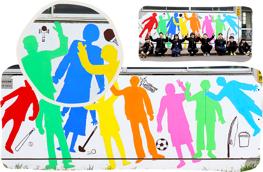 灰色だった壁にさまざまな色を塗ったことで、大変明るく華やかになったように思います。児童や地域の方々も壁の絵を見て、「いい思い出になる。」と喜んでいました。(楠本先生)