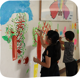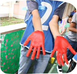 絵を描くことが苦手な児童が戸惑わないか、実施前心配をしていましたが、当日は、戸惑っている児童、絵が描けなくて悩んでいる児童はみかけませんでした。絵の得意、不得意に関係なく校内壁画制作を行っていたことは忘れられません。また、たてわり班のペアで活動したことで、仲も深まりました。