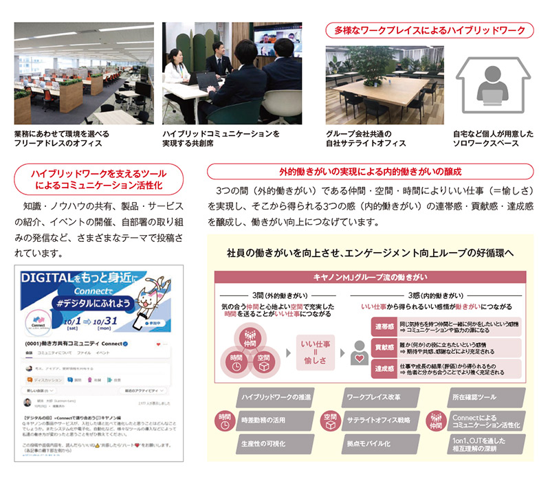 キヤノンMJグループでは、「働き方改革推進プロジェクト」を立ち上げ、働く環境の多様化とルールを整備しながら社員が活躍できる土台づくりに取り組んできました。今後は社員一人ひとりの自分らしさを生かす働き方の追求と、生産性向上の両立を実現する「働きがい改革」に向けた制度と施策により、グループ全社でより生産性の高い働き方を目指していきます。