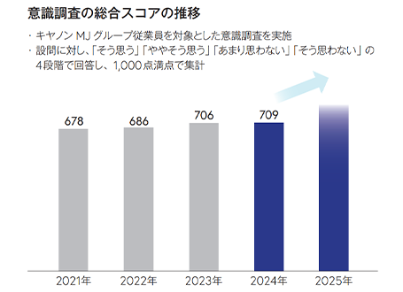 2021年より、「エンゲージメントの状態」を可視化するために、毎年1回、グループ従業員に意識調査を実施しています。調査は四択方式で行い、回答結果を1,000点満点で点数化し、主要となる20設問全てが肯定回答(667点以上)となることを目標としています。2024年度は20設問中14項目(2023年度は15項目)が肯定回答となりました。肯定回答の項目数は減りましたが、20設問の平均である総合スコアは709点となり、3年連続で向上しました。今後も、継続的に意識調査を実施するとともに回答内容を分析し、課題特定と対策を行うことにより、さらなるエンゲージメントの向上を目指します。