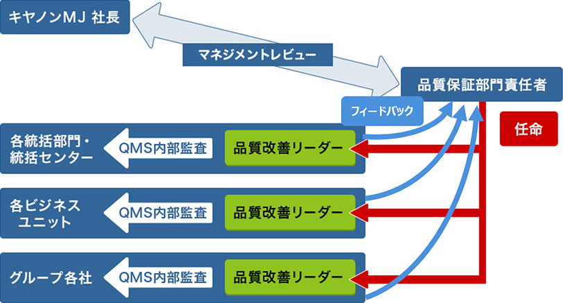 全社ガバナンス強化のため品質トップマネジメントをキヤノンMJ社長に一元化し、スピード、生産性、有効性をより高める各事業主体の「QMS自主運用活動」を展開しています。