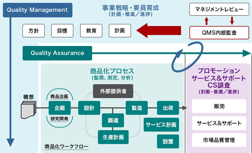 品質保証に関する全社共通ルールである「品質保証基本規程」、活動の詳細について定めた「品質マネジメントシステム細則」、各製品・サービス、サポートの特性に応じた各品質マネジメント要領に則り、商品化構想からアフターサービス終了までのプロセスの適正化、および各プロセスで得られる成果(アウトプット)の向上を図っています。