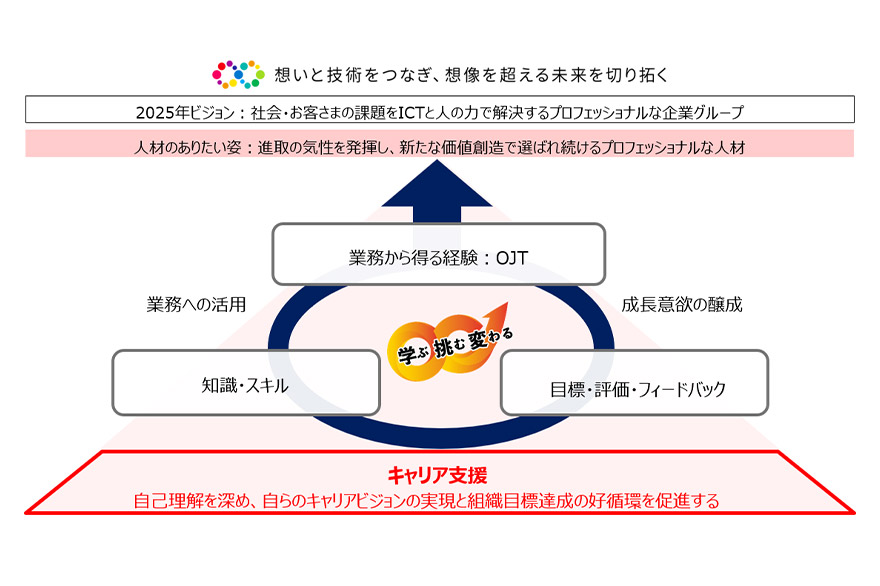 キヤノンMJでは、「社員が自律的に自らのキャリアを考え、目指すべきキャリアに向けて主体的に業務に取り組むことによる働きがいの向上と、自律した社員により活性化された組織風土の醸成」を目的に、社員のキャリア形成支援に取り組んでいます。