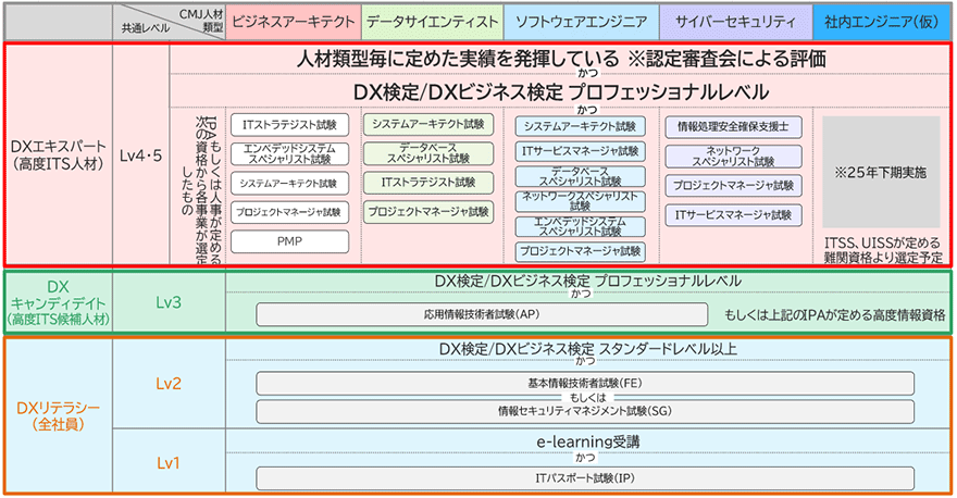 2025年4月より、デジタルスキル標準(DSS)を活用した高度ITS人材認定制度をスタートしました。本制度では、知識の保有と実績の2つの側面から審査を行い、レベル4以上の高度ITS人材をDXエキスパートとして認定します。レベル3の人材は高度ITS人材の候補者であるDXキャンディデイトとして扱い、高度人材に向けて育成施策を実施していきます。