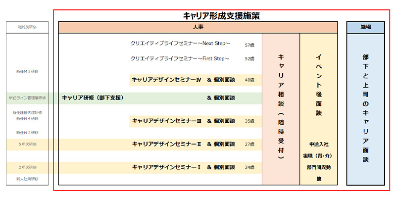各々の年代に合わせたキャリア研修と、社内キャリアコンサルタントとの個別面談