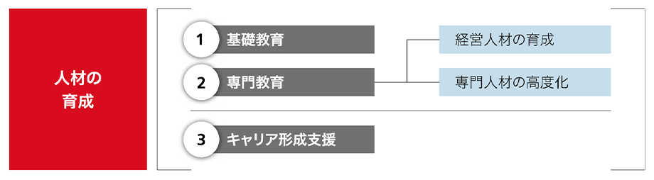 次期経営人材は、代表取締役社長を議長とし、社外取締役と社内取締役で構成された指名・報酬委員会で決定され、また、その候補者となる人材の育成については、人材戦略委員会において議論されます。重要ポジションへの任用や選抜研修への参加など具体的な検討が行われ、長期にわたる経営人材育成の仕組みを構築しています。