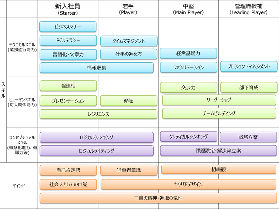 各階層で求められる基礎的なビジネススキルは、体系化した階層別研修によりプロモーションしたタイミングでインプットし、実践の場で身に付けるよう組み立てています。カッツモデル※をベースとして、コンセプチュアルスキル・テクニカルスキル・ヒューマンスキルを磨くことを目指しています。また、階層別研修に限らず、日常的なビジネススキルアップ支援のために、通信教育や外部セミナーの受講など多彩なプログラムで自発的な学びの機会も用意しています。