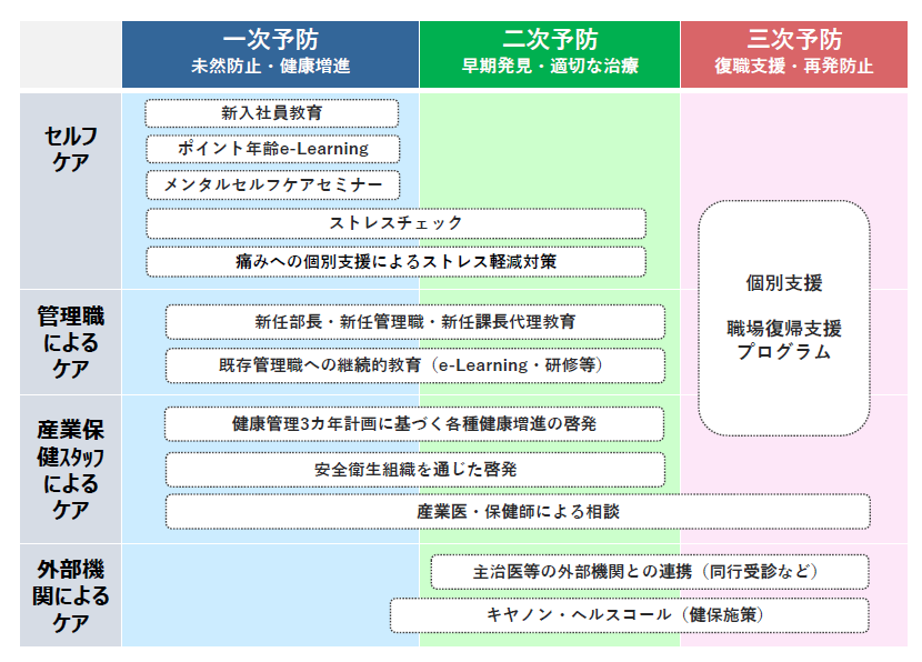 キヤノンMJグループでは、4つのケアと3つの予防策を軸にさまざまな教育、相談などのプログラムを行っています。例えば、新入社員向けのセルフケア研修、各年代別・階層別のeラーニング、階層別研修、キヤノン健保によるEAP(従業員支援プログラム)導入などに継続的に取り組んでいます。